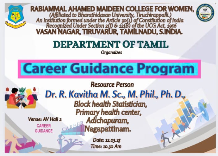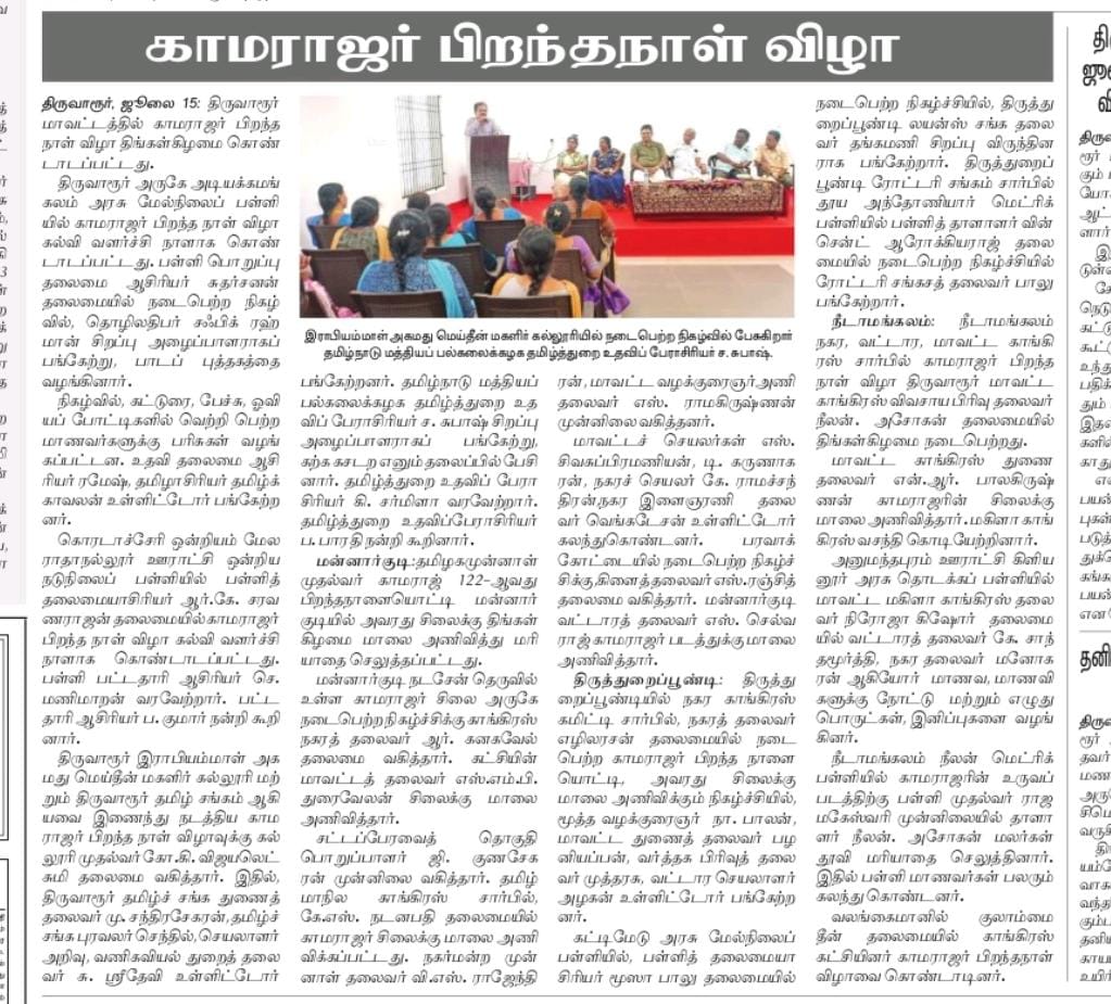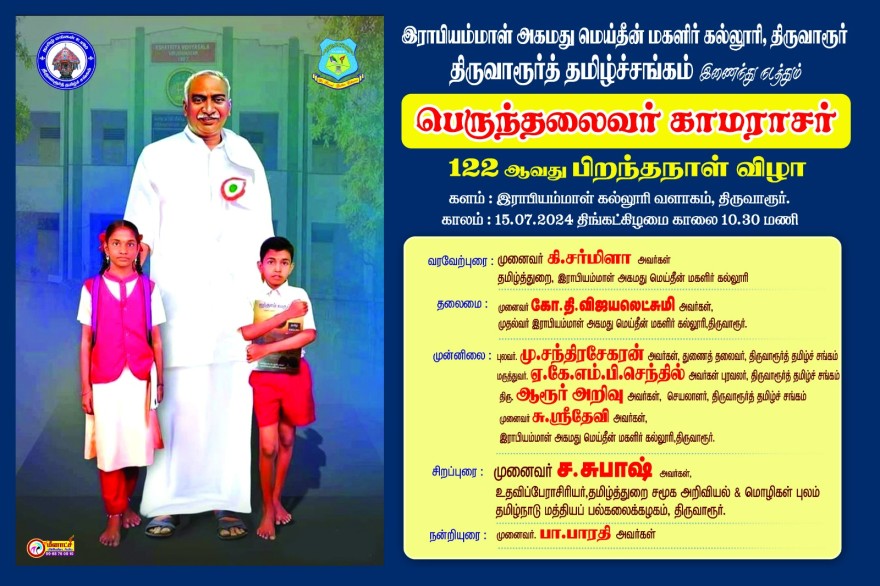 திருவாரூர் இராபியம்மாள் அகமது மெய்தீன் மகளிர் கல்லூரி தமிழ்த்துறை மற்றும் திருவாரூர்த் தமிழ்ச்சங்கமும் இணைந்து 15.07.24 இன்று காலை 10:30 மணியளவில் காமராஜரின் 122 வது பிறந்தநாள் விழாவினைக் கொண்டாடியது. அவ்விழாவின் சிறப்பு விருந்தினராக முனைவர் ச.சுபாஷ், உதவிப் பேராசிரியர், தமிழ்த்துறை, சமூக அறிவியல் மற்றும் மொழிப்புலம் தமிழ்நாடு மத்தியப் பல்கலைக்கழகம் திருவாரூர் அவர்கள் கலந்து கொண்ட தருணம்./font>