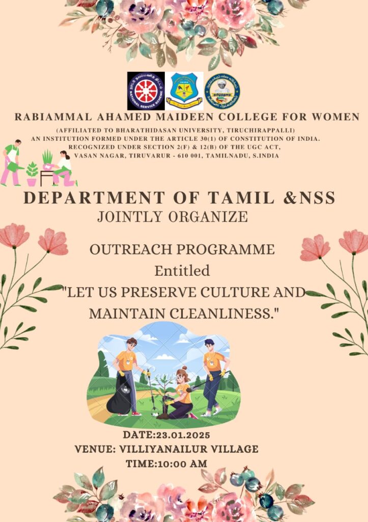 தமிழ்த்துறை இலக்கிய, இலக்கணங்களை கற்பித்தலோடு மட்டும் அல்லாது பழங்கால தமிழரின் பண்பாட்டை விதைப்பதில் 12 வருடமாக கல்லூரியில் செயல்படுகிறது.