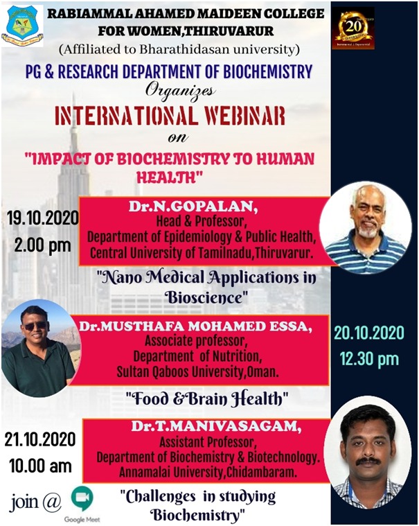 - To be recognized as a centre for excellence in Biochemistry that provides an atmosphere to acquire skills in identifying the link between biological and human resources and transform it to enhance the quality of life.